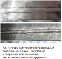 После изготовления пробного ударного и подкладного инструмента был проведен практический эксперимент. Ил. 6 показывает экспериментальный инструмент и этапы техпроцесса формирования ребра жесткости и канавок. В ходе эксперимента, нам удалось получить ребра жесткости и характерные канавки вдоль них (ил. 7).