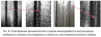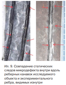 Анализ результатов экспериментального ребра жесткости показал сходство микродефектов с экспонатом № 0137/235. Ил. 8 демонстрирует сходство динамических следов. Ил. 9 показывает сравнение статических следов, которые видно изнутри. При сравнении статических и динамических следов микродефектов оригинала и экспериментального ребра жесткости обнаружены их сходства. Это прямо указывает на одинаковые рабочие поверхности экспериментального инструмента и используемого для изготовления ребер жесткости памятника № 0137/235.