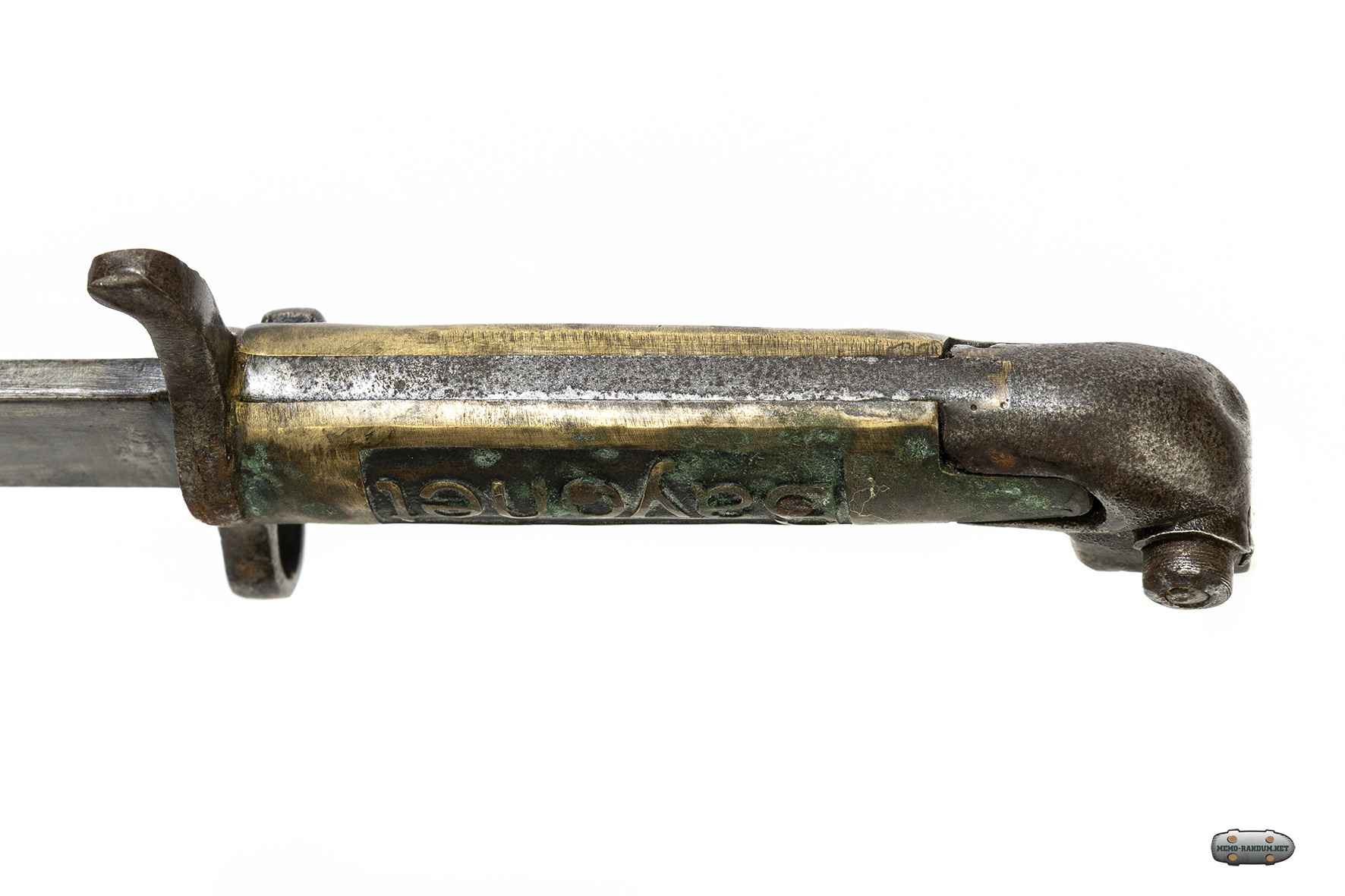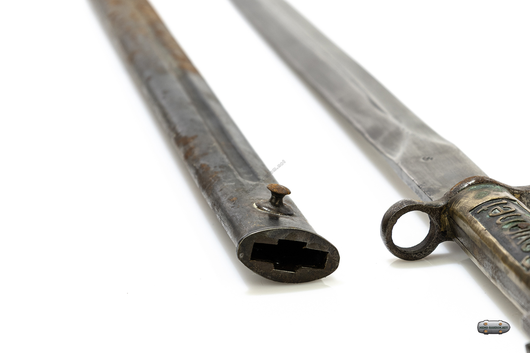 Рукоять образована двумя деревянными накладками ( на нашем экспонате, латунные, неоригинальные), которые крепятся к хвостовику двумя винтами. Особое внимание привлекает стальная головка рукояти. Она имеет Т-образный паз и оснащена пружинной защёлкой, спиральная пружина которой размещена внутри. На самой рукояти также расположен пружинный фиксатор, который надежно удерживает клинок в ножнах при ношении.