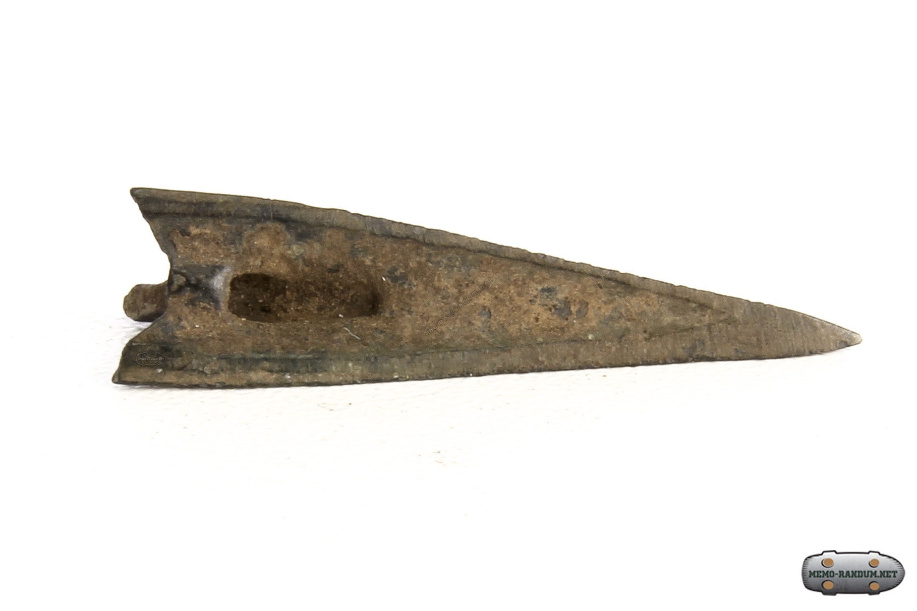Скифский бронзовый наконечник стрелы VIII в до н э — IV в н э как видите остриё наконечника повреждено что свидетельствует что стрела скорее всего достигла цели. Весьма крупный наконечник для скифов так как зачастую в более поздний период длинна и форма наконечников стрел скифов была иной и составляла 2,5-3,5 см.