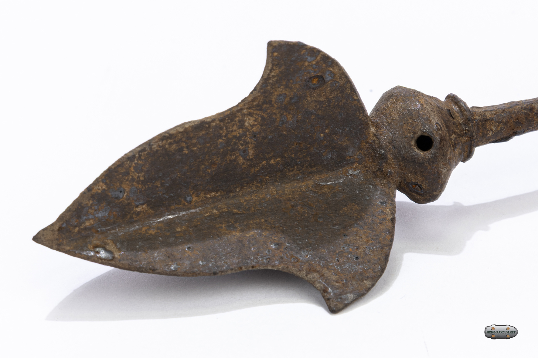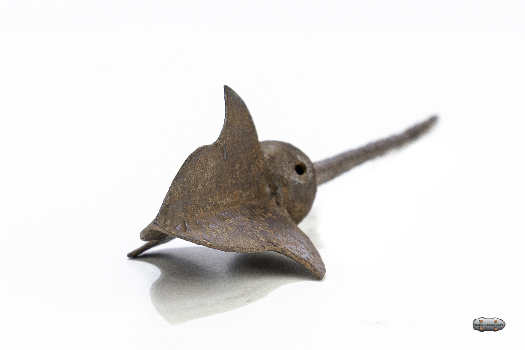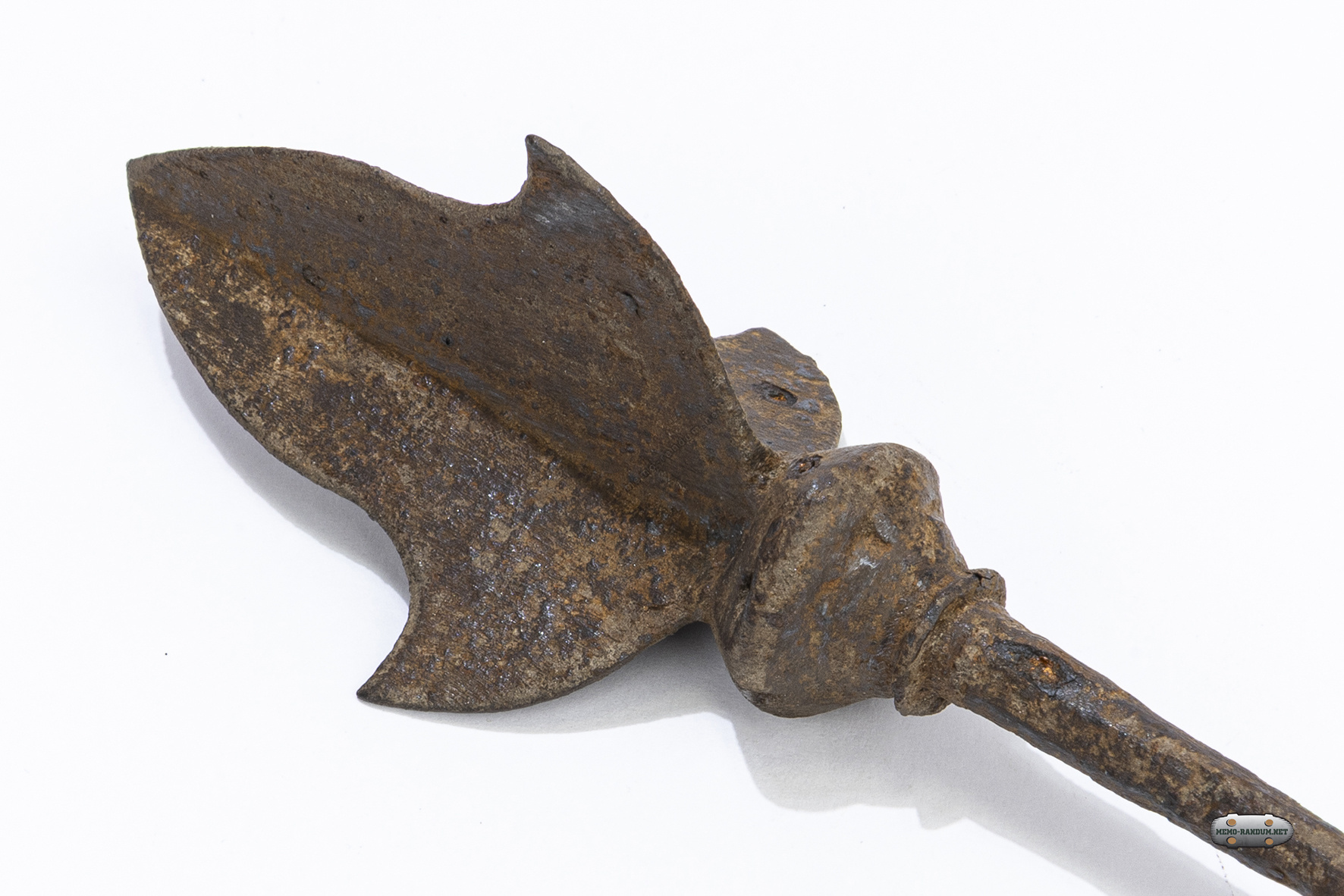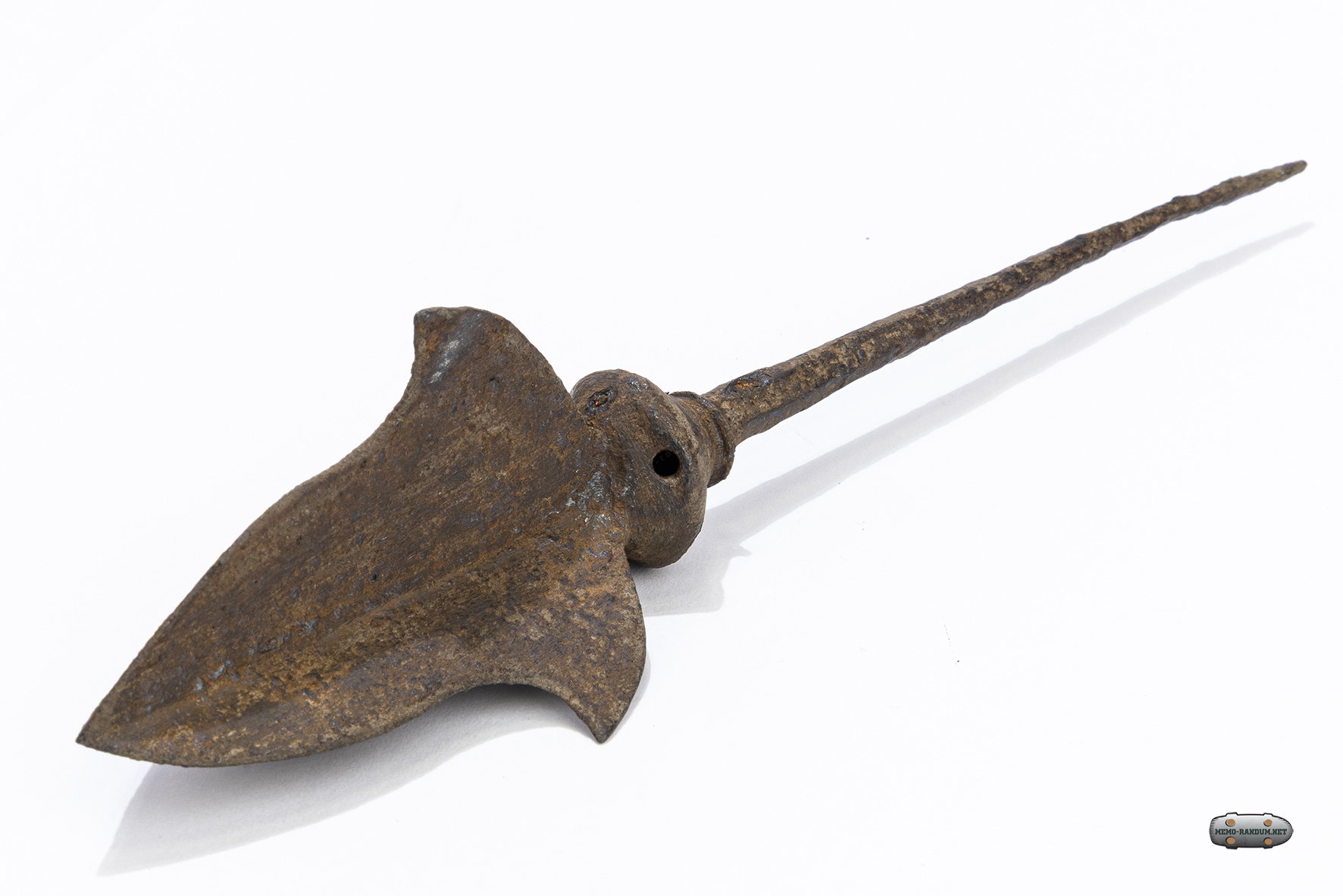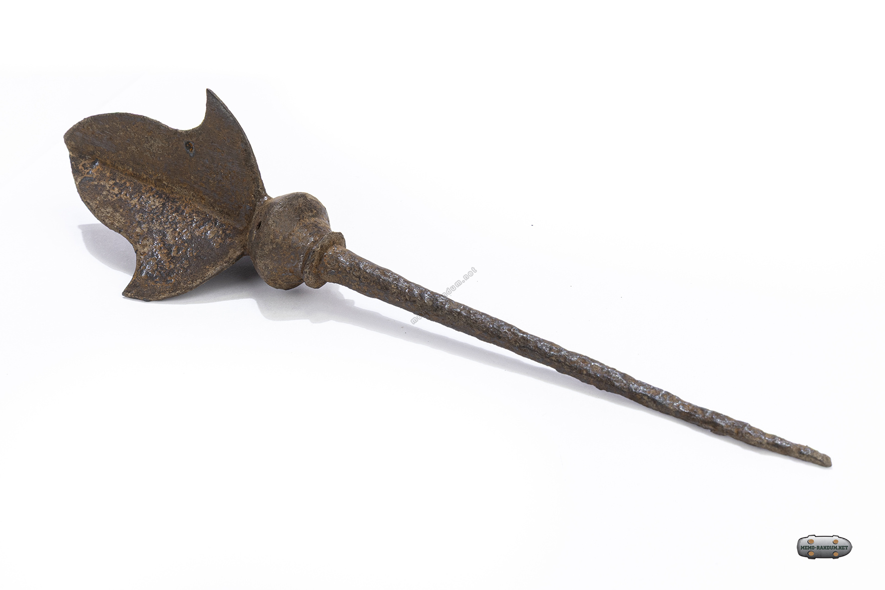 Данный артефакт представляет собой свистящий наконечник стрелы. Изначально подобные свистки изготавливались из кости, керамики или рога и имели сферическую камеру-резонатор с несколькими отверстиями. Однако в случае данного экспоната, шарообразный свисток выкован железа,и выглядит единым целым с самим наконечником.