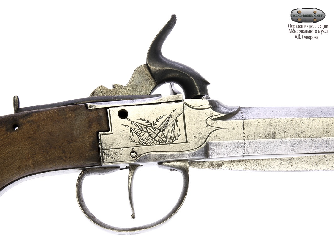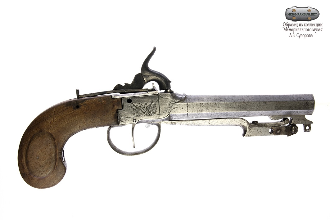 Жилетный пистолет с капсюльным замком, изготовленный в первой четверти XIX века. Корпус замка украшен гравировкой. Деревянная рукоять пистолета гладкая. Скоба представляет собой защелку, при отведении которой назад, раскладывается подпружиненный штык, расположенный под стволом.