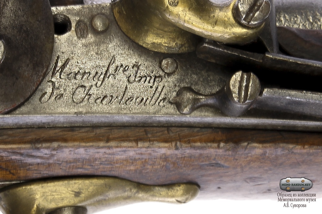 На лицевой поверхности замочной доски нанесена маркировка, указывающая на место изготовления оружия: «Manuf Imp le de Charleville» — императорская мануфактура Шарлевиль (Manufacture Imperiale Charleville).