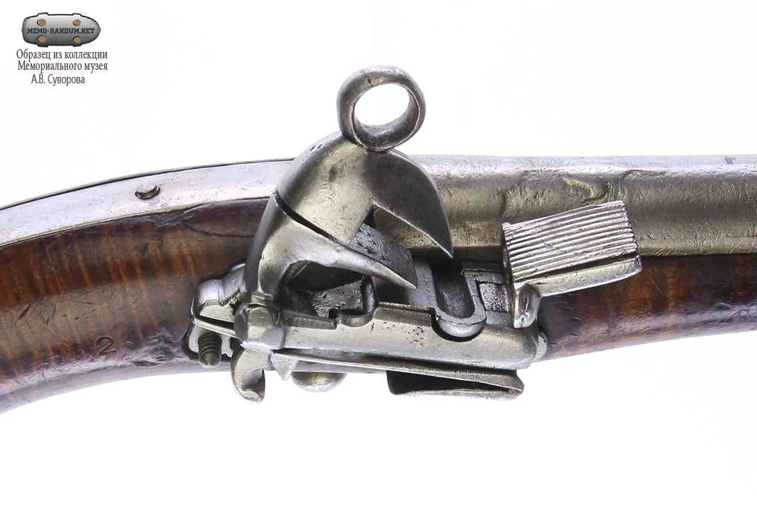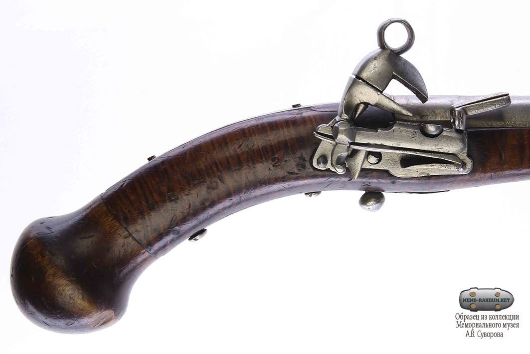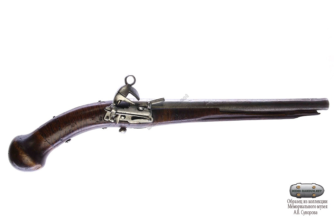 Пистолет составной. Ствол из дамаской стали круглый гладкий, на дульной и казенной части со следами чеканки в виде растительного орнамента, сверху по стволу идет узкий рельефный хребтик, железный хвостовик - от ствола до яблока, около ствола на хвостовике прицельная прорезь. Замок азиатский, кремневый, железный, огниво вставное, курочный винт - с кольцом. Прибор железный: зигзагообразная фигурная личинка под замочные винты, спусковая планка с короткой фигурной передней и длинной задней пожилинами, спуск - в виде шарика, замочные и хвостовые винты. Яблоко кубанчинского типа, деревянное. Ложа коричневого цвета.