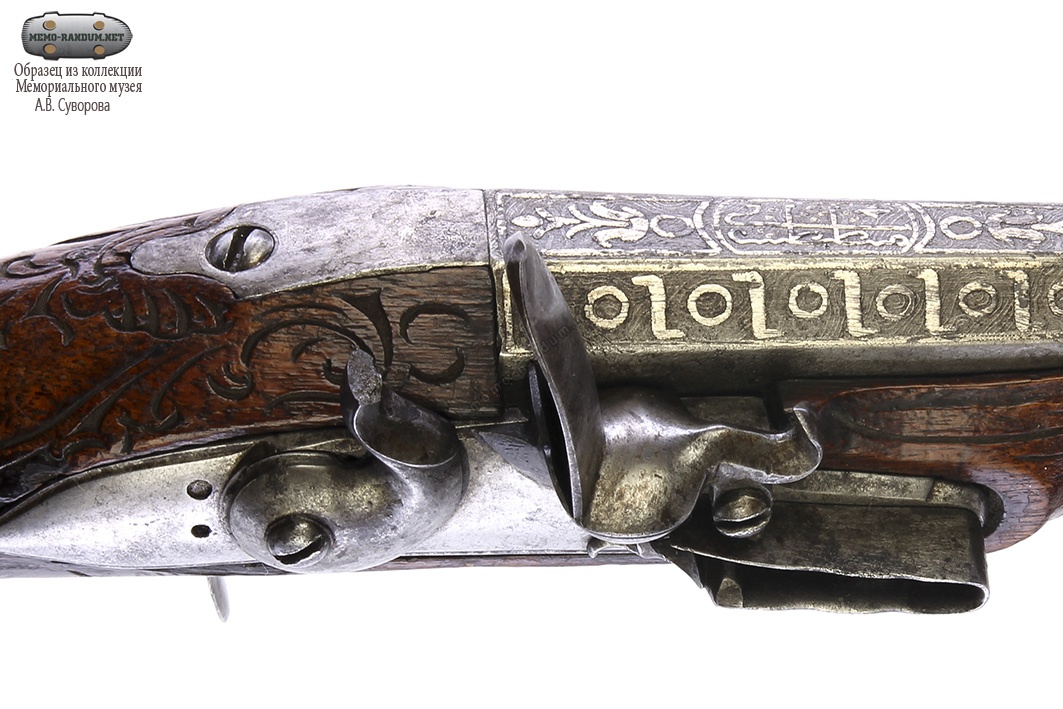 Санкт-Петербургское государственное бюджетное учреждение культуры "Государственный мемориальный музей А.В. Суворова"Состоит из ствола, замка и ложи с прибором. Ствол из дамасковой стали, в дульной части круглый, в казенной части восьмигранный. Хвостовик трапециевидный с фигурным концом, с вкрученным винтом. Ствол крепится к ложе тремя ложевыми шпильками. Средней шпилькой крепится и шомпольная трубка. В верхняя часть ствола уплощена, с напаянной круглой мушкой в дульной части. В казенной части, по верхней поверхности и вокруг мушки ствол украшен насечкой белым металлом геометрическим и растительным орнаментом. На верхней грани в казенной части ствола насечкой в рамке, предположительно, надпись. Шомпол деревянный с железным наконечником из двух металлических разнонаправленных спиралей, закрепленный двумя длинными пожилинами с тремя шпильками. Замок кремневый, стальной, состоит из замочной доски, полки, курка, огнива, огнивной пружины. Все детали закреплены соответствующими винтами. Замок крепится к ложу с помощью двух замочных винтов и фигурной накладки под винты с левой стороны казенной части ложи. Ложа деревянная, резная, украшена резным растительным орнаментом. В рукояти шпилька. Цевье одной длины со стволом. Конец цевья из темного рога. Прибор белого металла, гладкий, утоплен в ложе, более поздний: фигурный медальон шейки рукояти, фигурная накладка под замочный винты, набалдашник рукояти с фигурной пожилиной и крепящим винтом, пожилины спусковой скобы, фигурная шомпольная трубка.