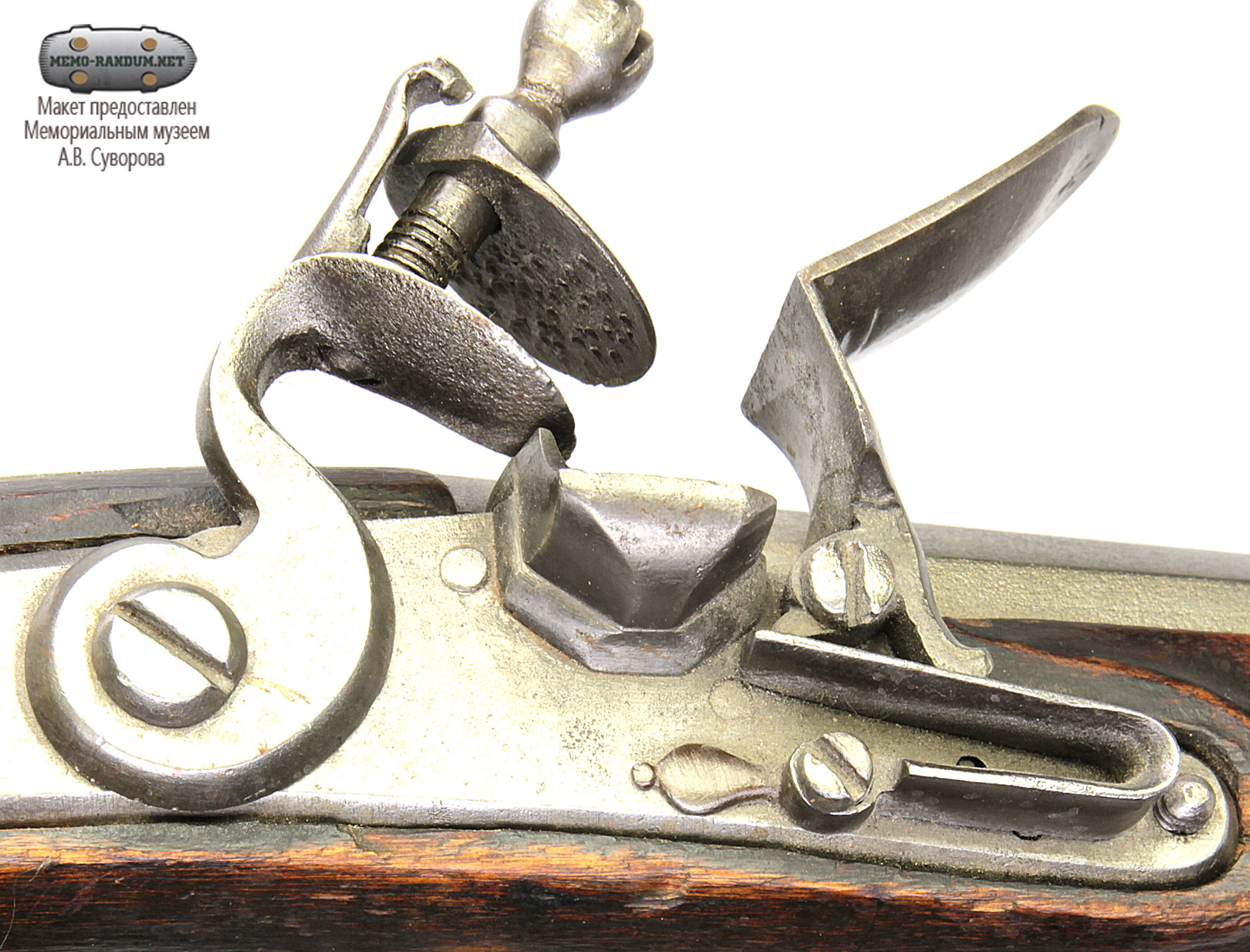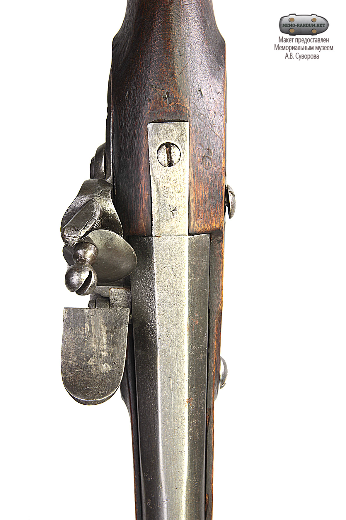 Все перечисленные детали закреплены с помощью соответствующих винтов на замочной доске. Замок крепится к ложу с помощью двух замочных винтов с левой стороны казенной части ложи. Ложа деревянная, резная, коричневого цвета, цевье незначительно короче ствола. Прибор железный: набалдашник рукояти с гвоздем и длинными пожилинами, фигурная спусковая скоба, фигурная накладка под замочные винты, спусковой крючок, спусковая планка, винты, шпильки. По краю набалдашника глубокая вырезанная черта. Шляпка гвоздя набалдашника овальная гладкая. Пожилины спусковой скобы длинные, фигурные.