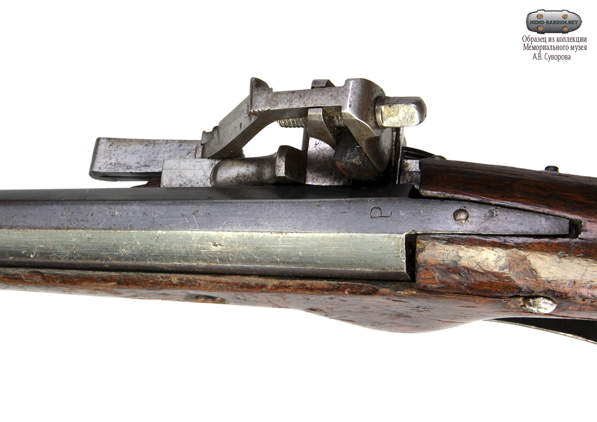 Прибор железный: спусковая скоба, спусковой крючок, шомпольная трубка, винты. Вокруг окончания рукояти - железный ободок. На устье цевья - железный наконечник. Ложа лакированная, окрашена в коричневый цвет.