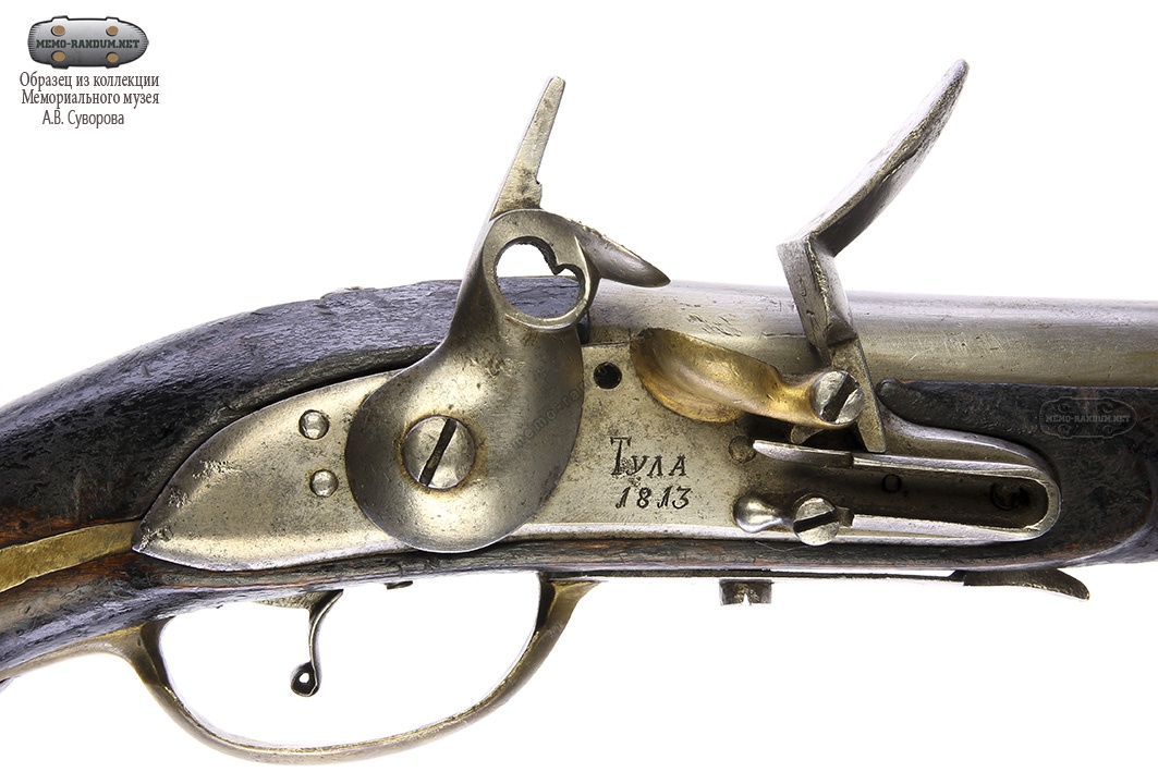 Яблоко рукояти с боковыми заходами на рукоять из латуни, закреплено латунным, фигурным болтом. Замок кремневый, верхний зажим отсутствует. На правой щечке гравированная надпись "Тула 1813".