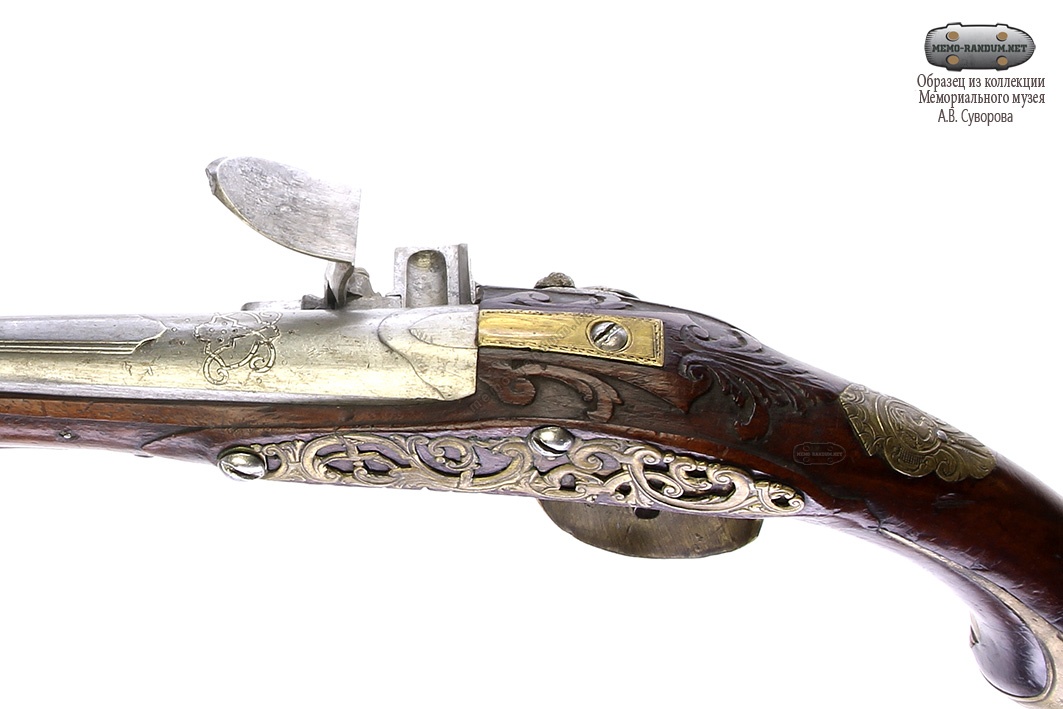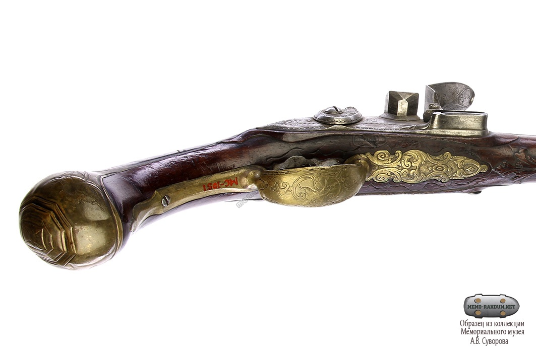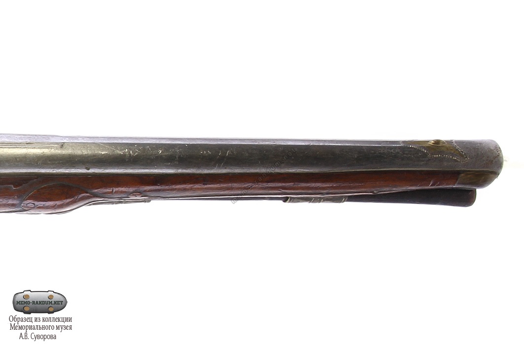На рукояти сверху - ажурный латунный щиток с погрудным изображением человека. Ложа резная покрашена в коричневый цвет, лакирована, наконечник цевья - из рога. Шомпол деревянный с утолщенной головкой.