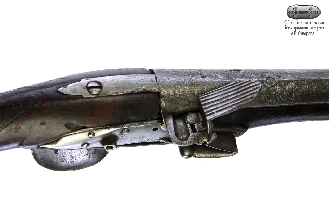 Замок кремневый, отсутствует курок. На правой щечке замка полустертая гравированная надпись либо узор. Шомпол отсутствует, крепление на пистолете не предусмотрено.