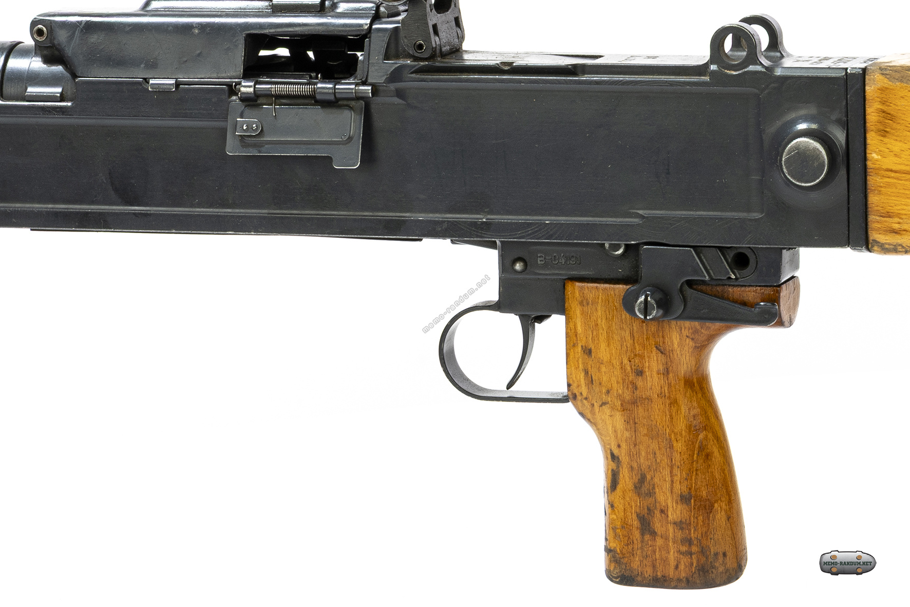 - Предохранитель и спуск: Флажковый предохранитель над спусковым крючком. У ручного варианта — пистолетная рукоятка с спусковым крючком; у станкового — спаренные горизонтальные рукоятки с гашеткой между ними и механизмом вертикальной и горизонтальной наводки.