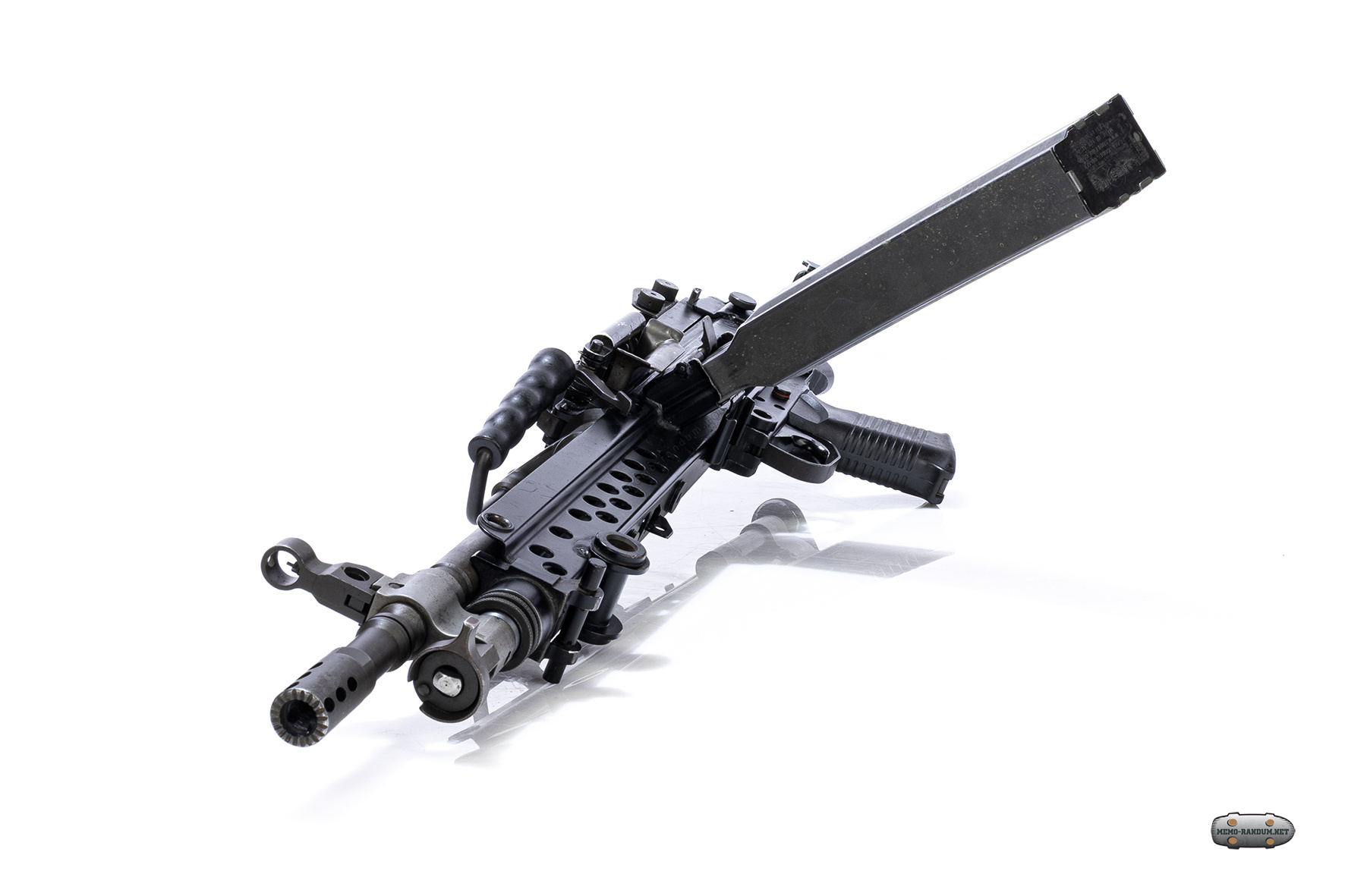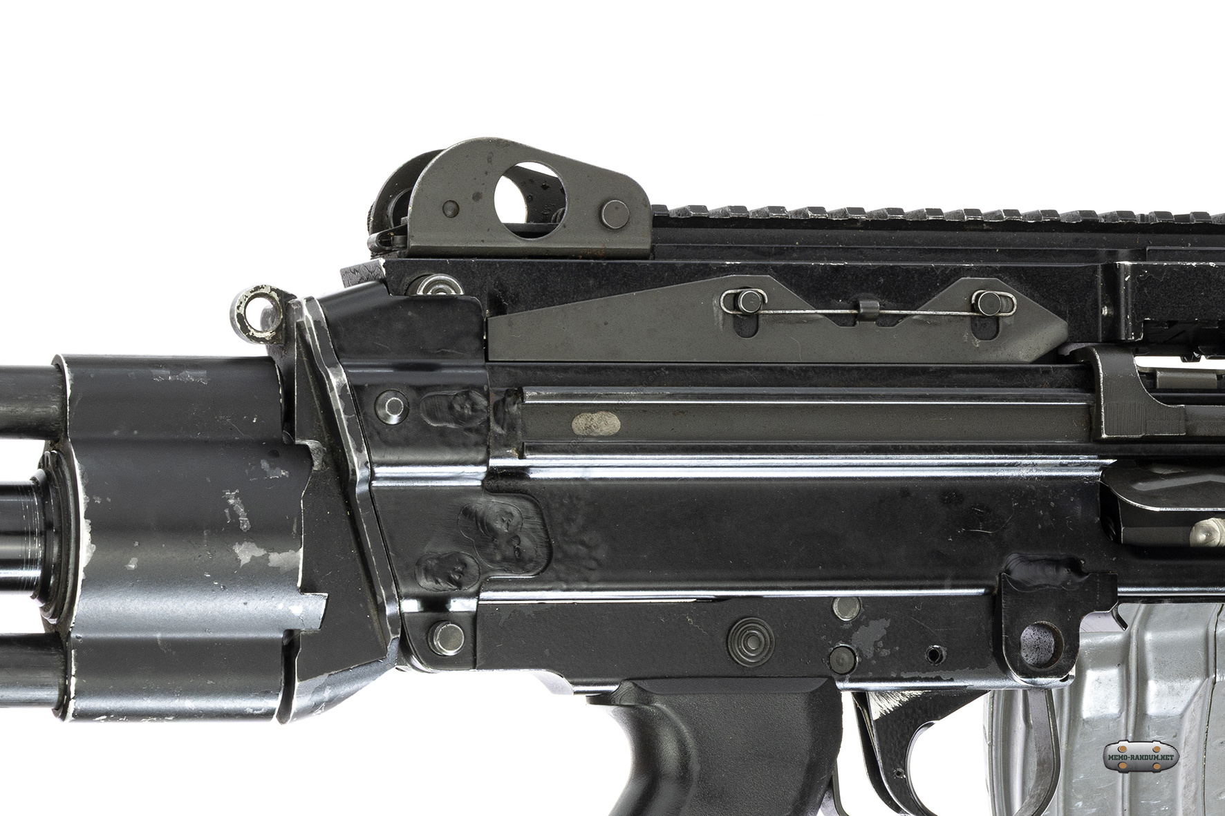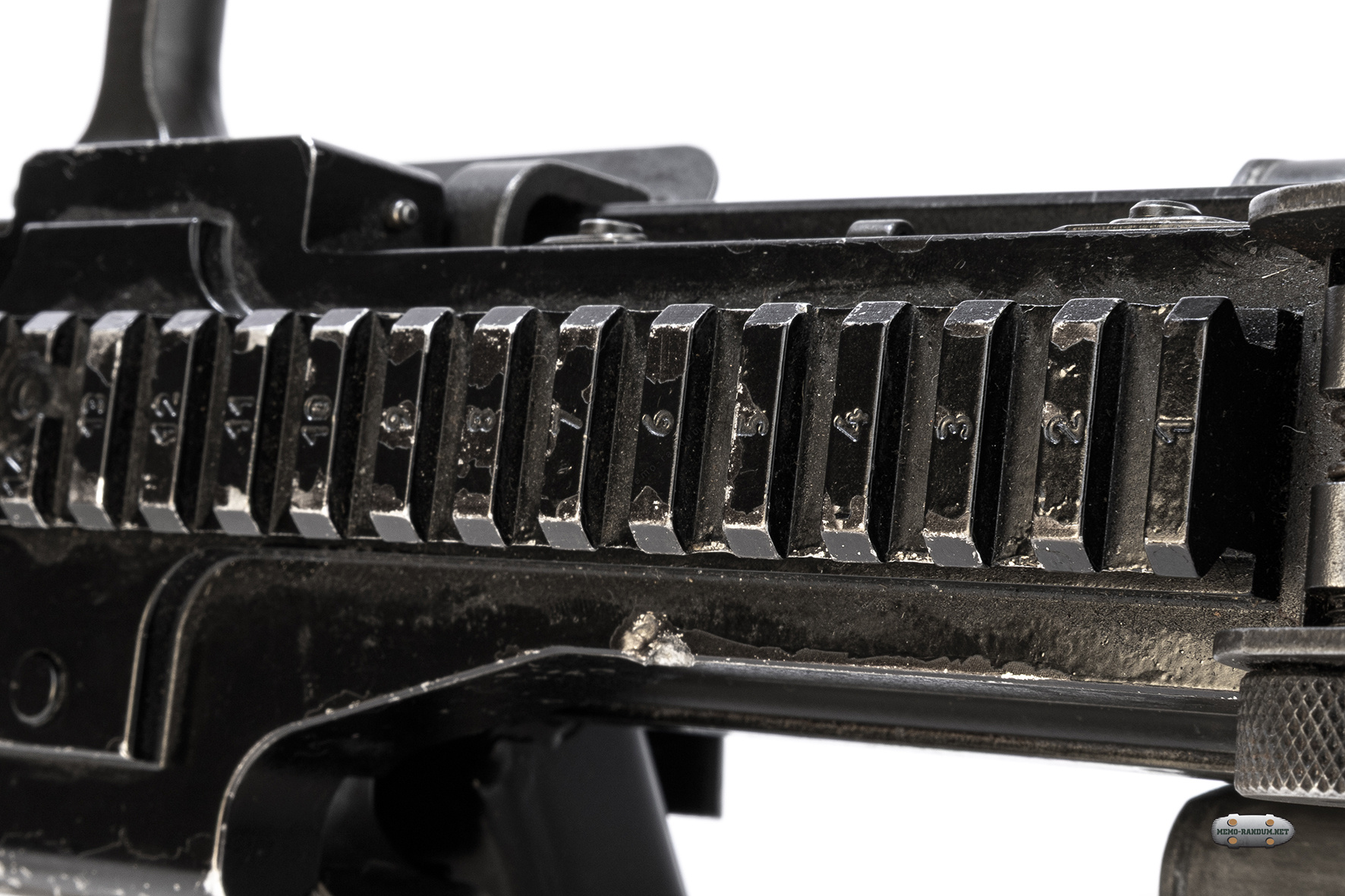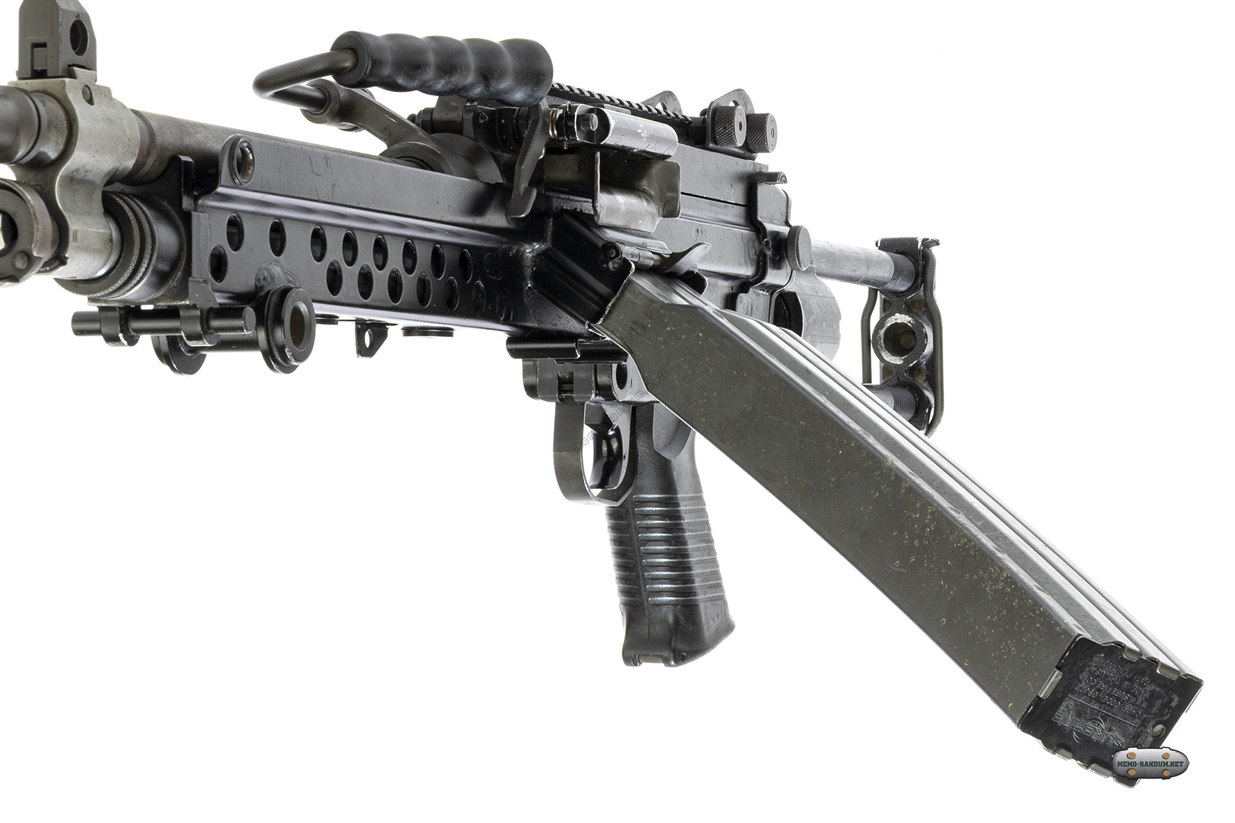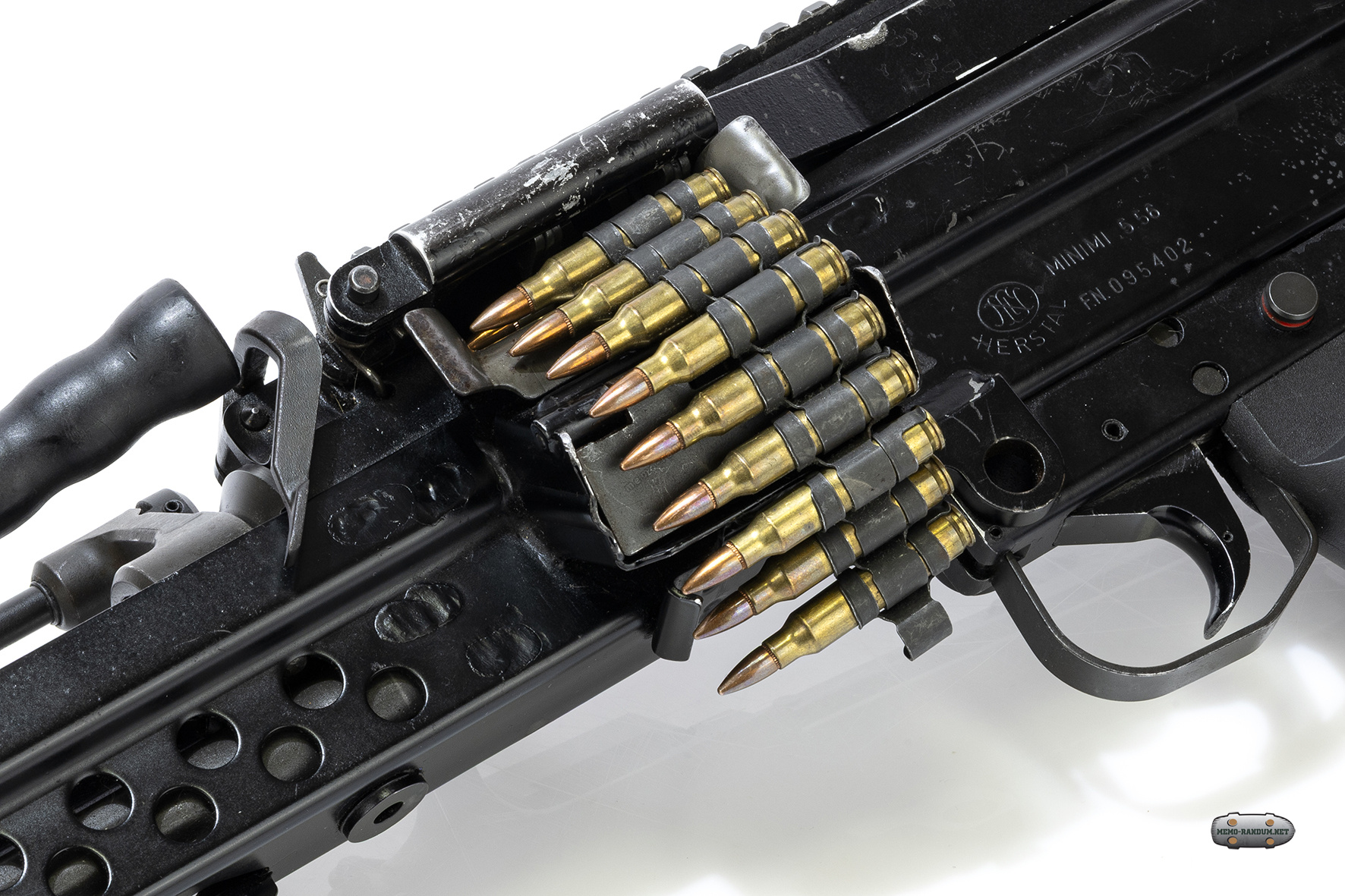 К пулемету (к данному экспонату) примкнут магазин фирмы Surefire на 60 патронов. на фотографии ниже боепитание осуществляется при помощи разъёмно-звеньевой ленты M27.