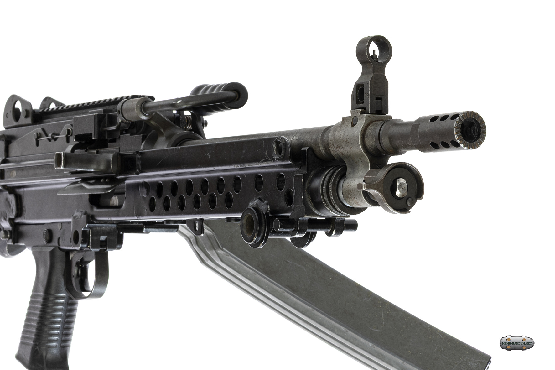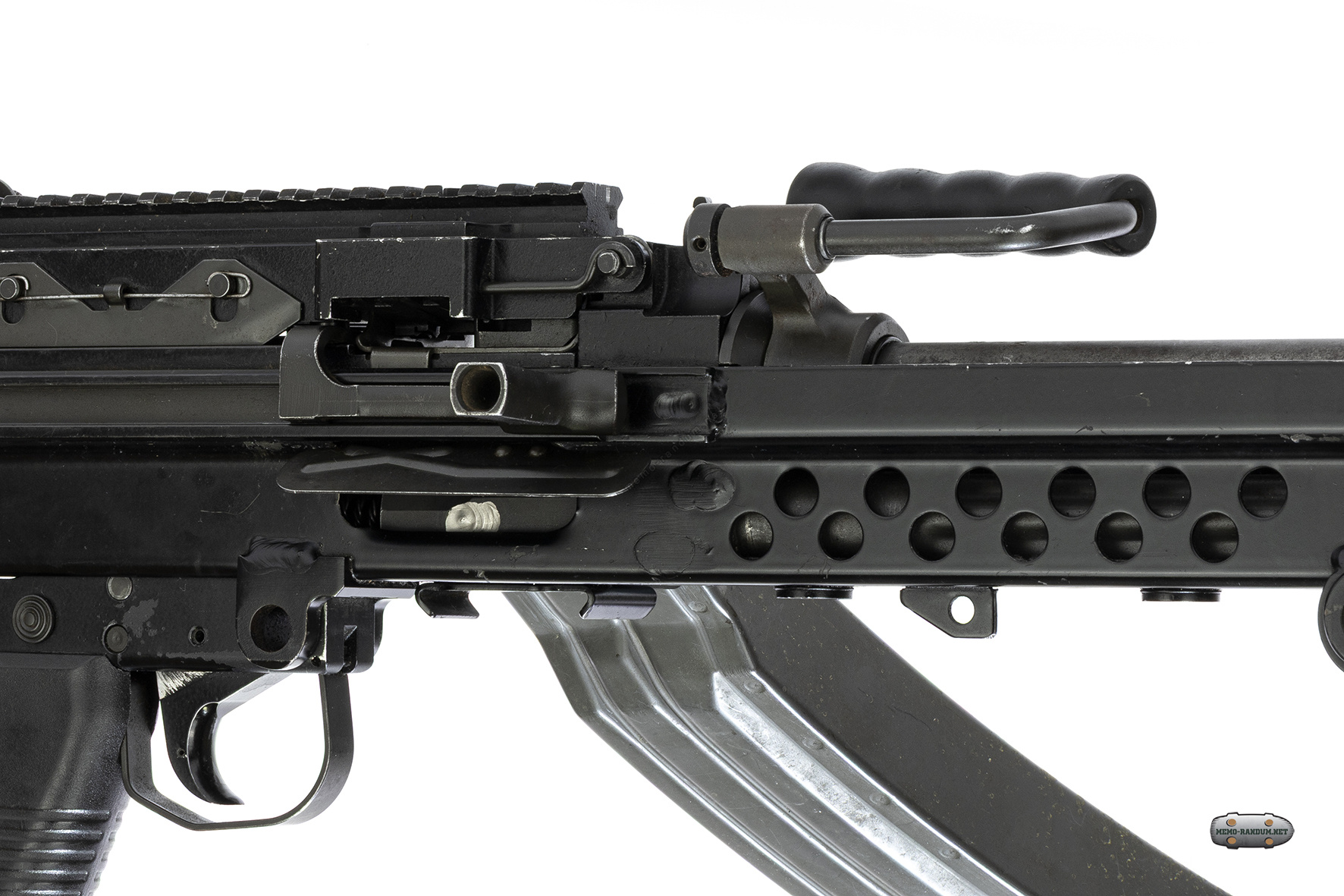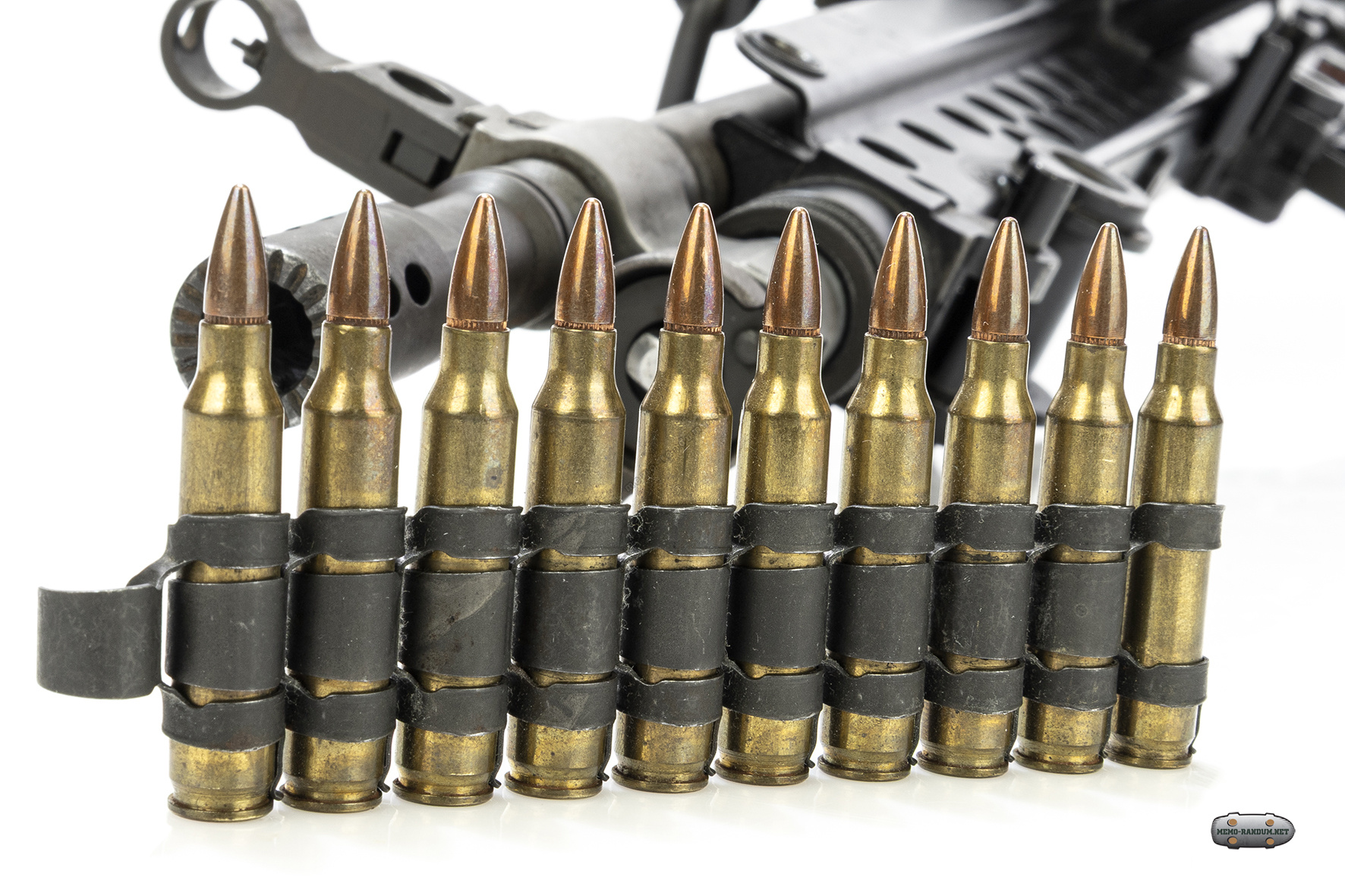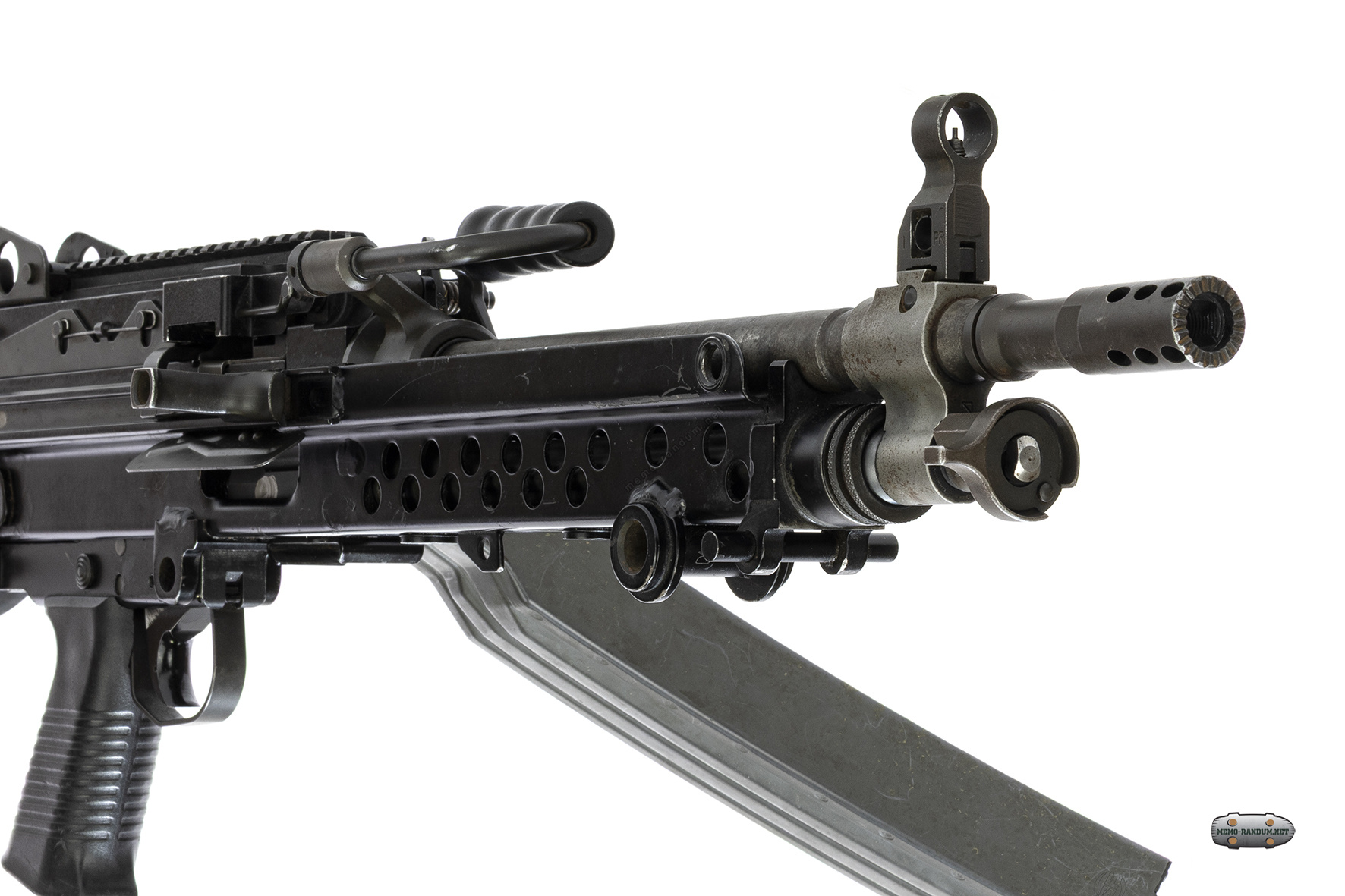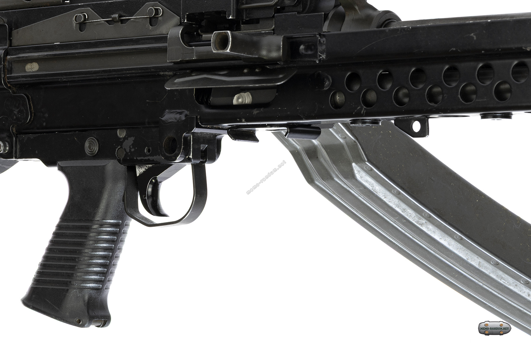 К пулемету (к данному экспонату) примкнут магазин фирмы Surefire на 60 патронов. на фотографии ниже боепитание осуществляется при помощи разъёмно-звеньевой ленты M27.