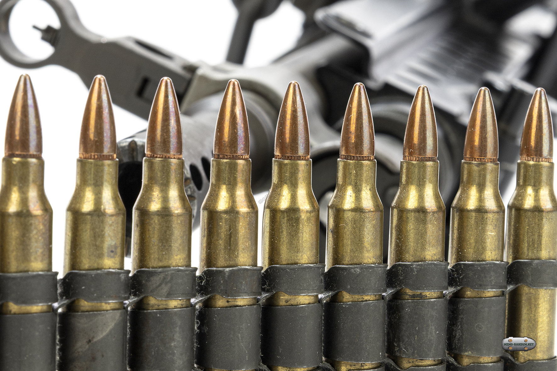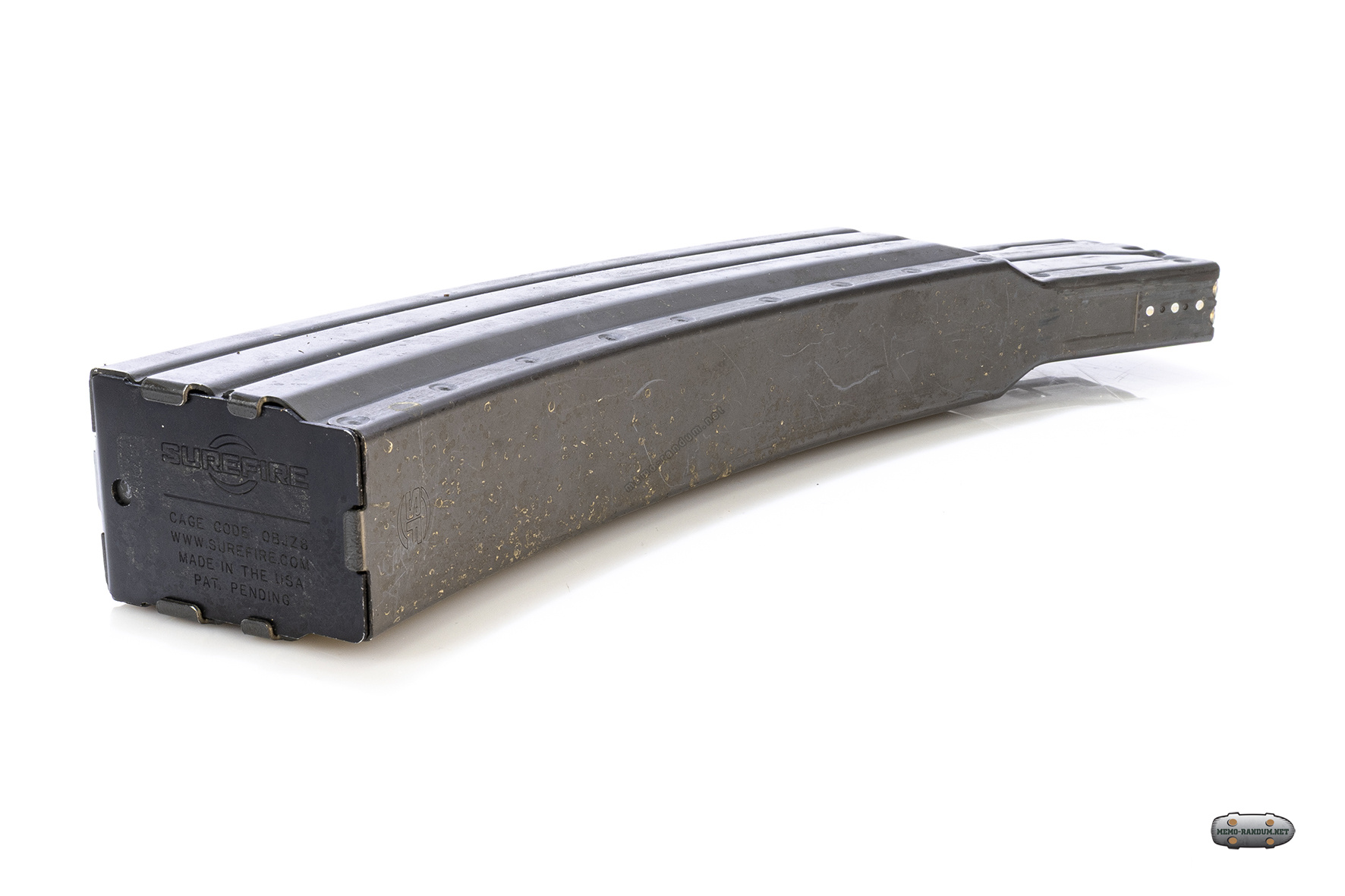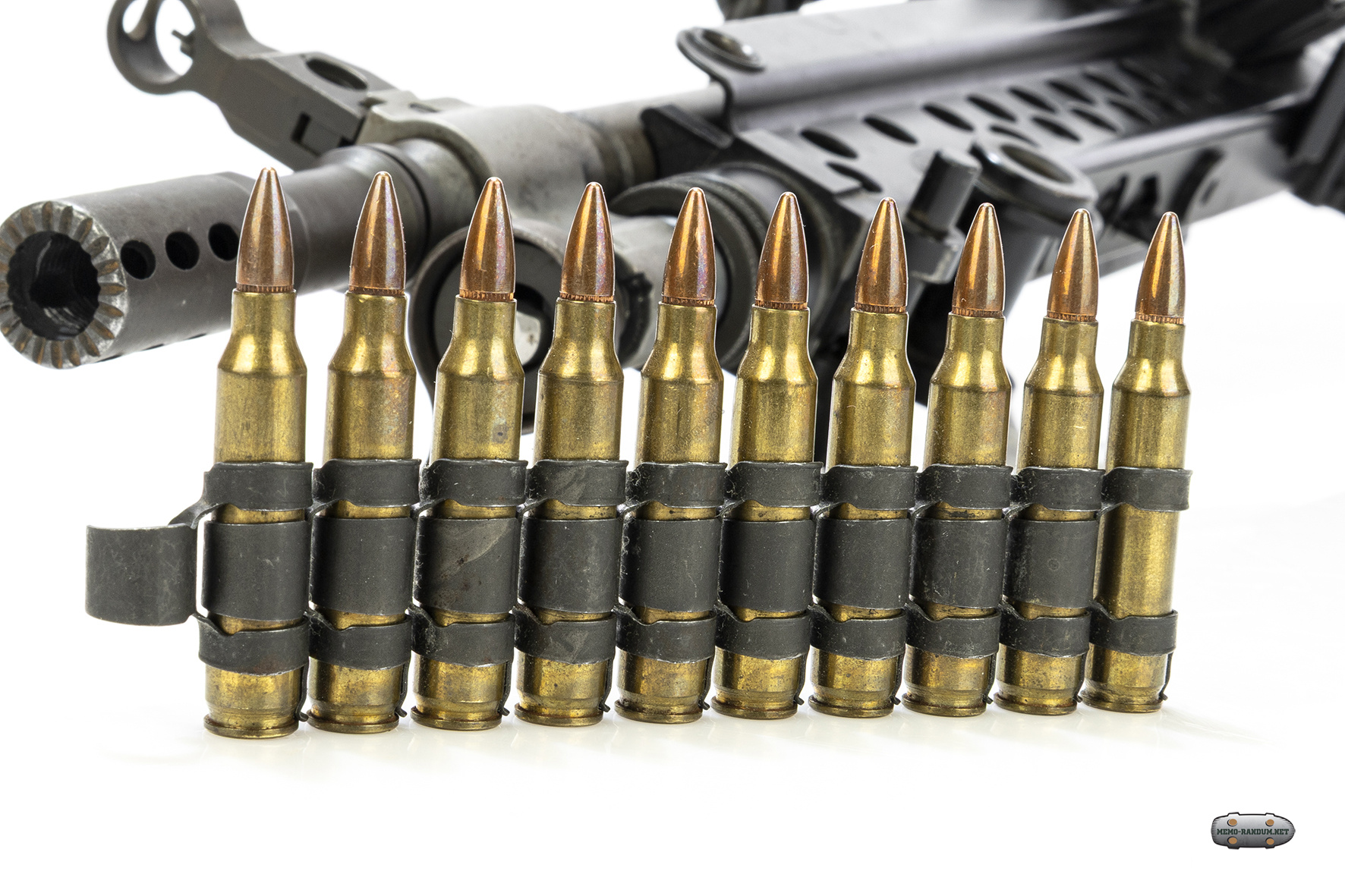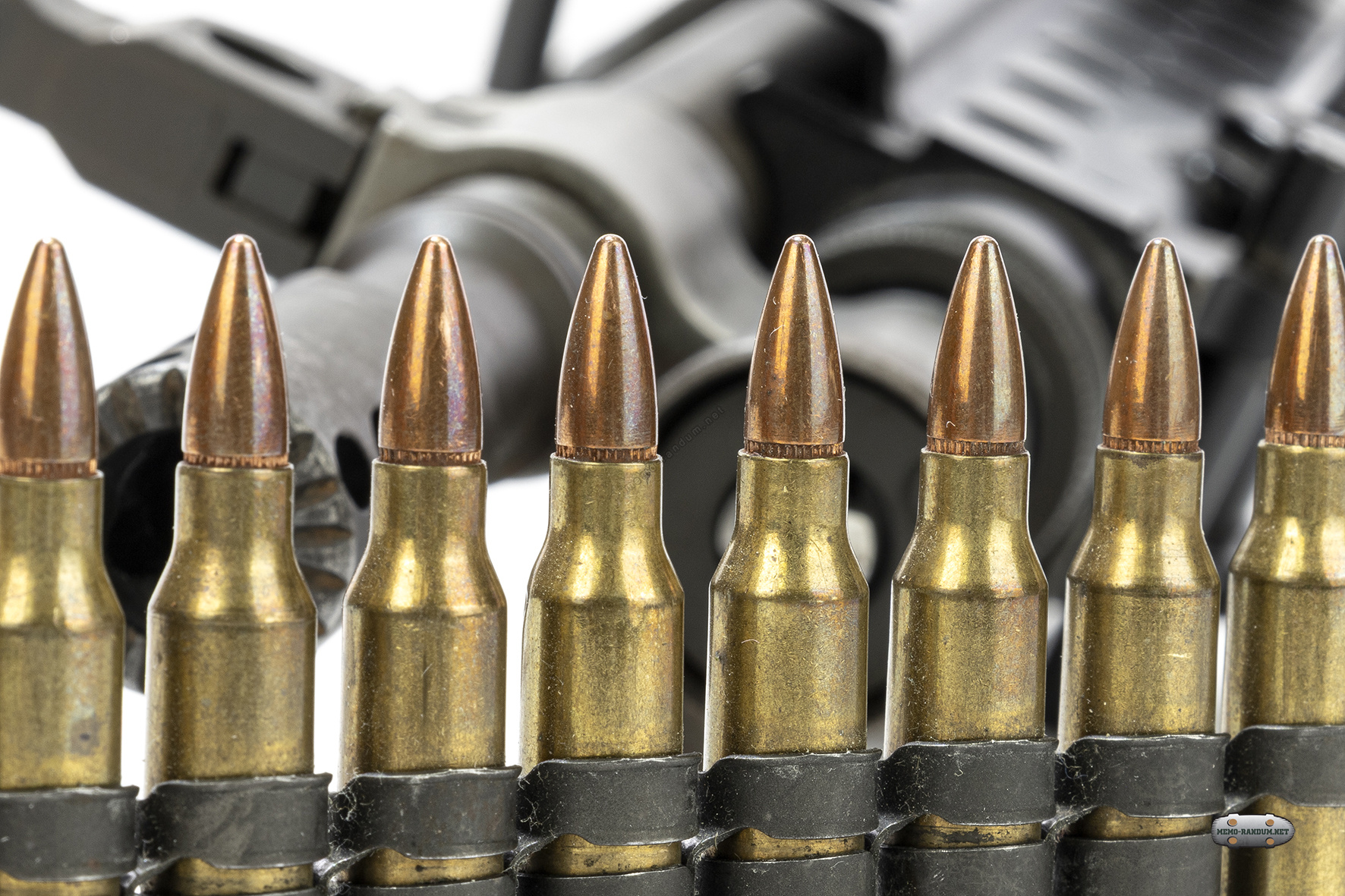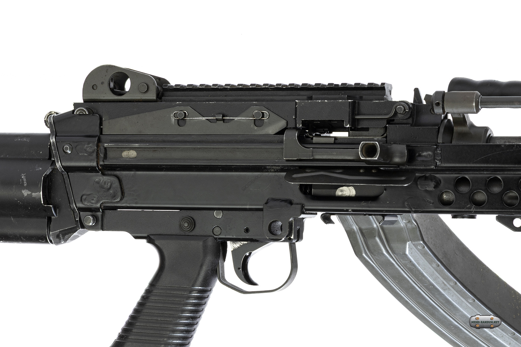 К пулемету (к данному экспонату) примкнут магазин фирмы Surefire на 60 патронов. на фотографии ниже боепитание осуществляется при помощи разъёмно-звеньевой ленты M27.