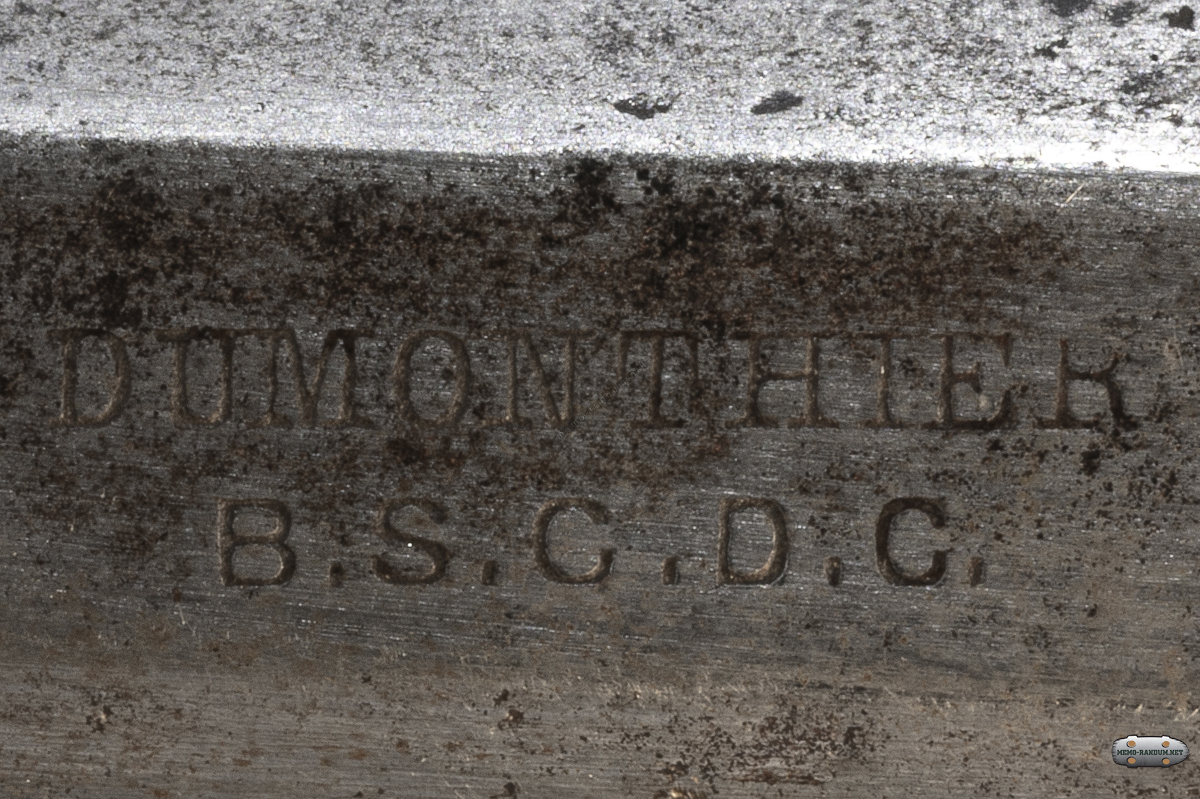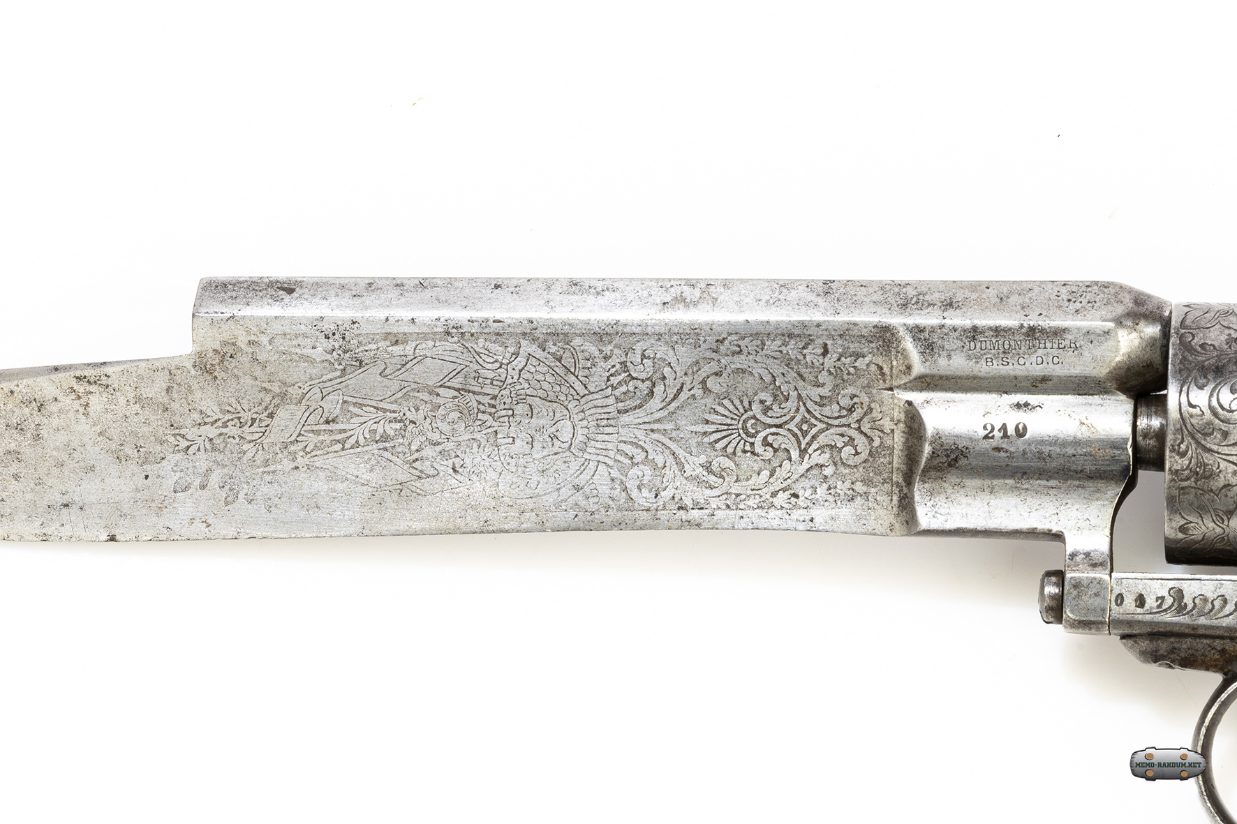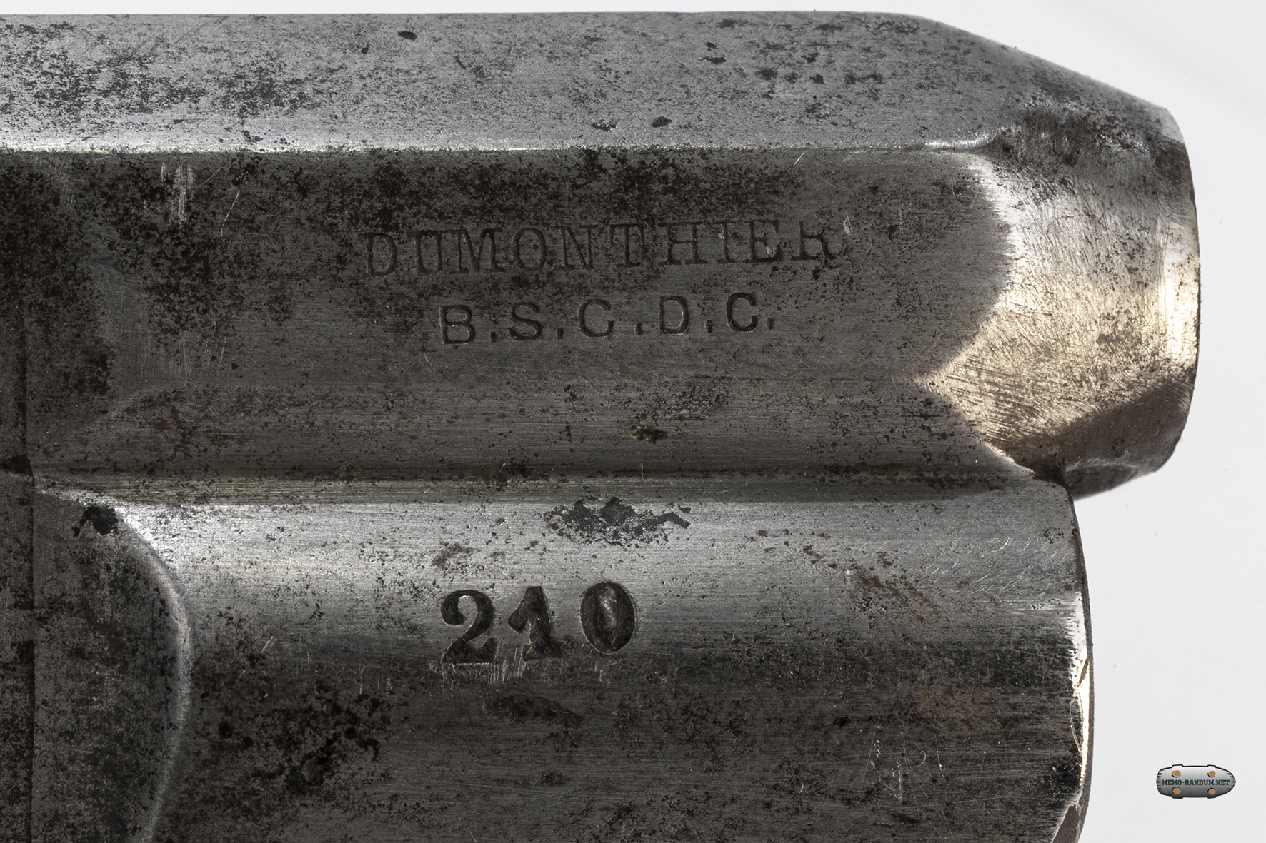 DUMONTHIER B.S.C.D.G. -Клейма нанесены с левой стороны револьвера на стволе ближе к барабану. Наименование завода изготовителя (Фамилия оружейника) и аббревиатура b.s.g.d.g. (Фр.) breveté sans garantie du gouvernement ((Англ) patented without government guarantee). Означает, что государство подтверждает использование патента но без гарантий качества самого государства. "Патент есть но о качестве не знаем"