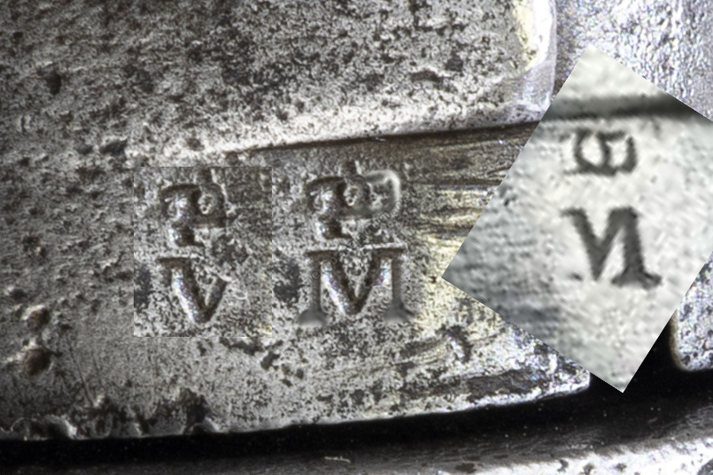 Изначально клеймо было похоже на латинскую букву V, но позже стало понятно, что это плохо проштампованная буква M. Клеймо проштамповано одинаково в разных частях револьвера, можно предположить, что само клеймо имело дефект. ниже, фотография реконструкции клейма. Крайнее клеймо с лева, то что было проштамповано на револьвере, правый край клеймо с другого револьвера, середина реконструкция существующего клейма на экспонате.